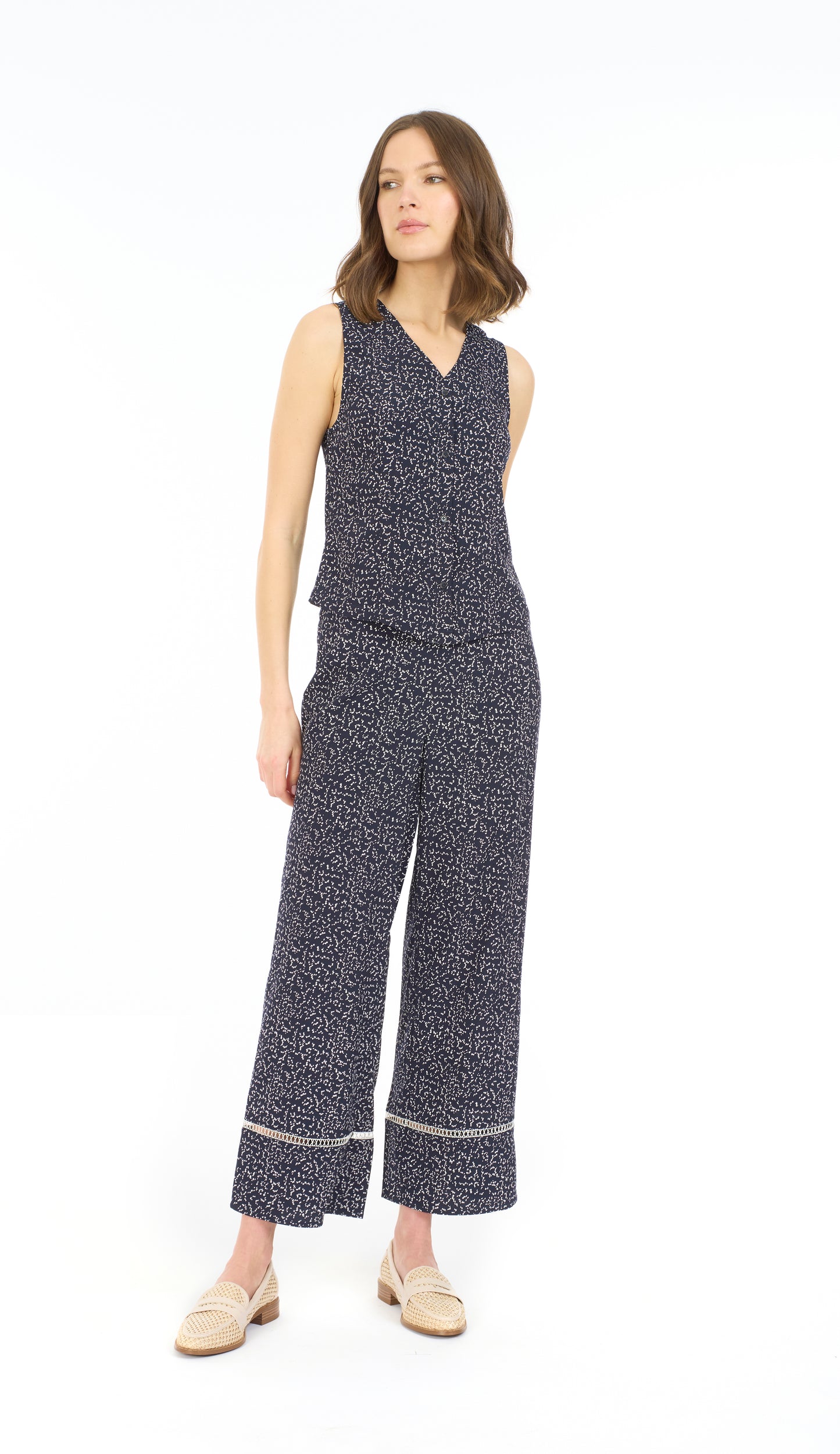 Woven Crepe de Chine Pant with Lattice Trim inset at hemline.